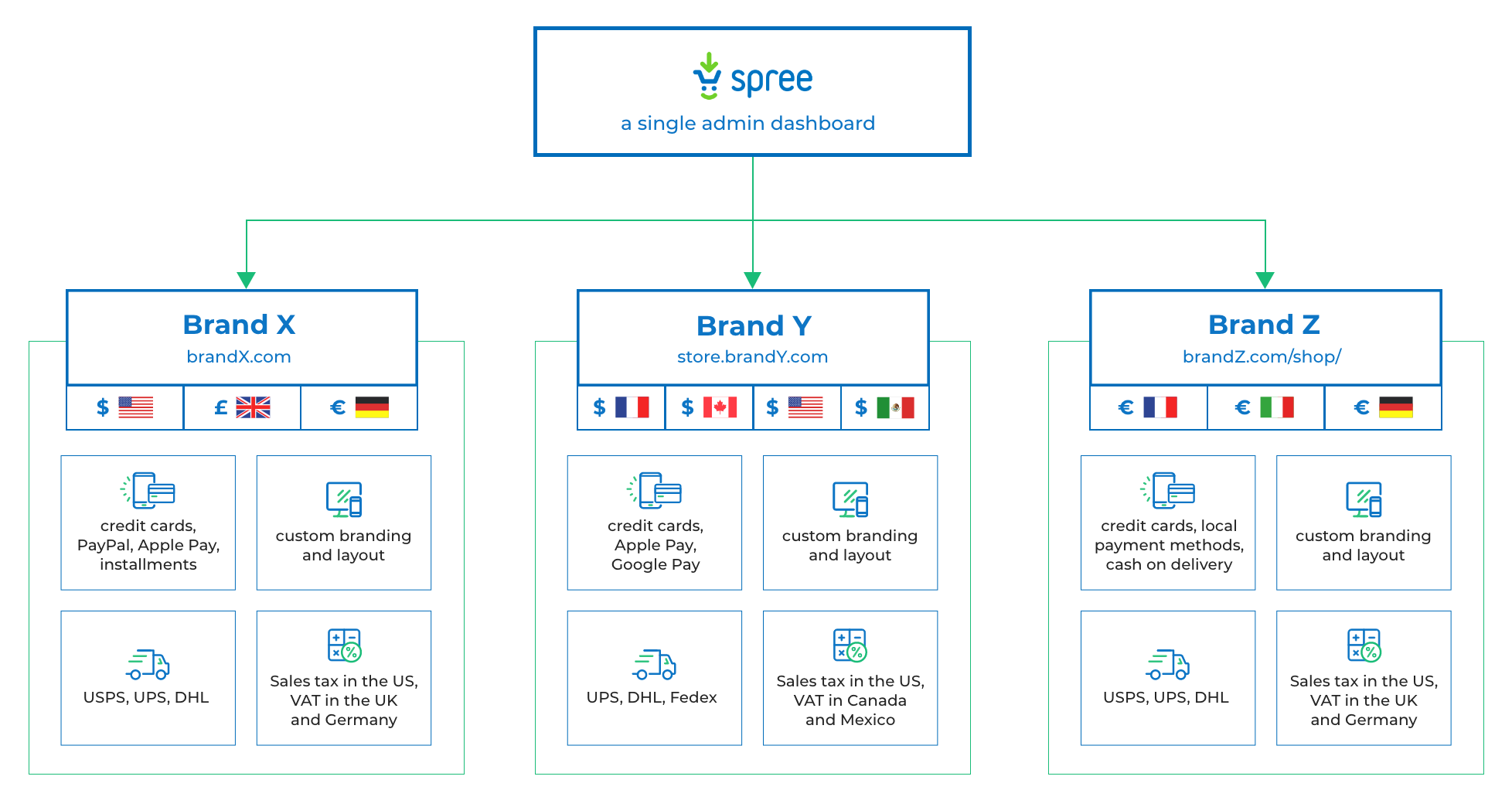 Spree will try to determine the current store based on the current URL. If the URL does not match any of the stores in the database, Spree will fall back to the default store. All Spree controllers or any other controllers that include Spree::Core::ControllerHelpers::Store have access to thecurrent_store method which returns the Store matching the current URL.