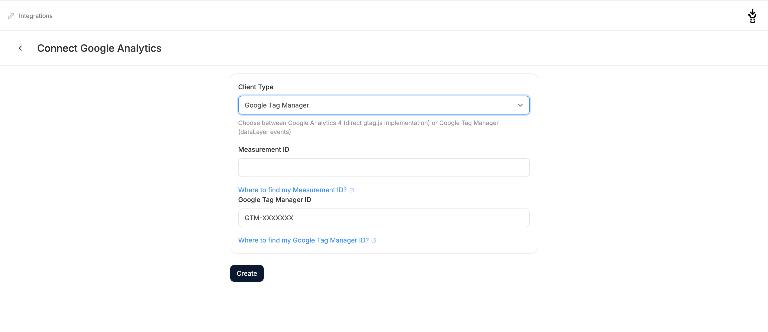 This integration allows you to use either Google Tag Manager or Google Analytics 4 - but not both at the same time. Only one key (GTM or GA4) should be active in the integration settings. If you plan to use GA4 with GTM, you must set up GA4 inside of your GTM workspace manually.