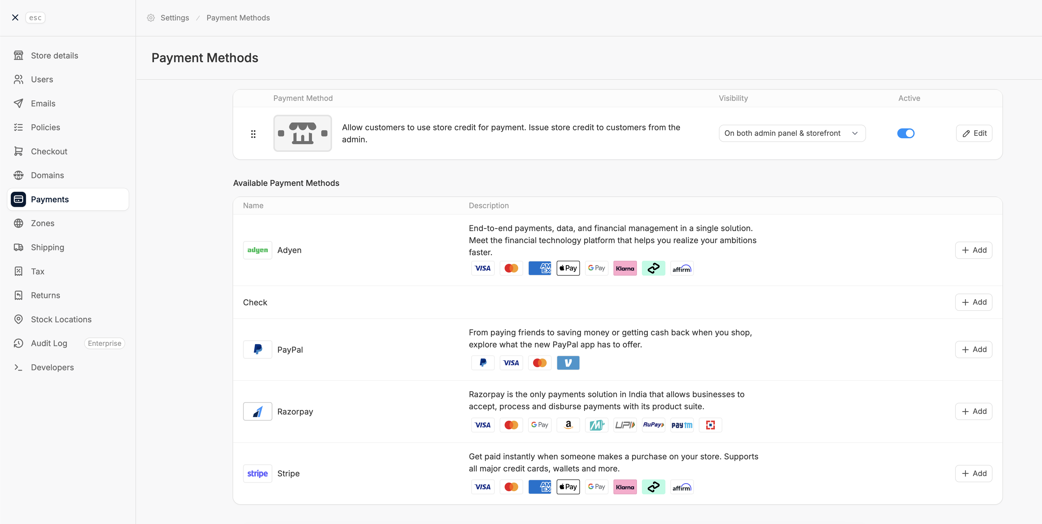Sign in to your Spree admin dashboard and navigate to Settings → Payments.