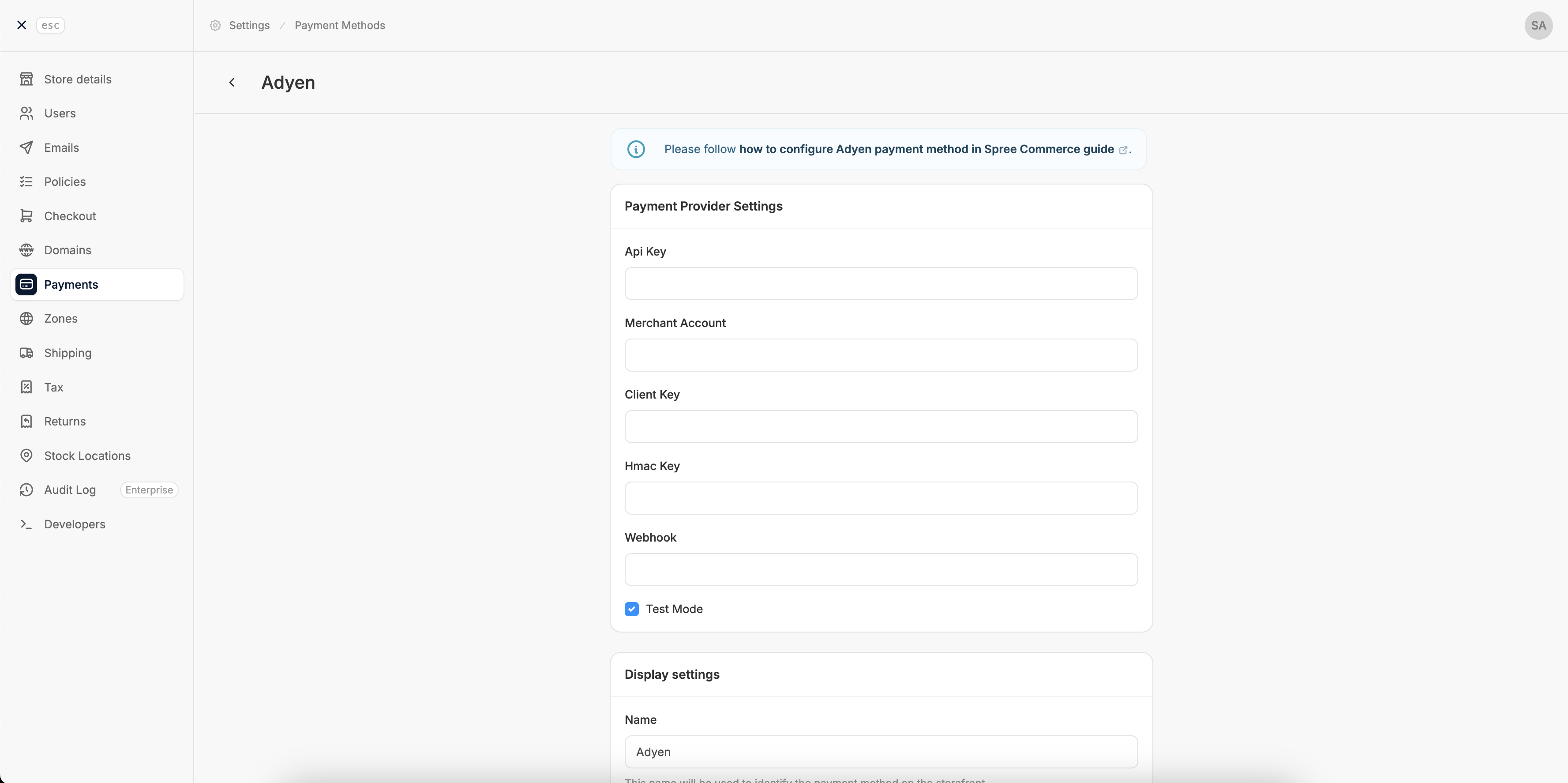 If you want to test your checkout flow without processing real payments, Adyen’s test mode is a safe and effective way to simulate transactions. To enable it, simply switch your Adyen Customer Area to Test mode and paste the corresponding test API credentials into the payment method settings in Spree.Features