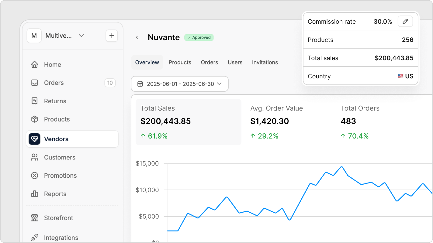 - Marketplace Management - invite vendors, approve or reject vendor signups, suspend accounts, and monitor vendor performance metrics.