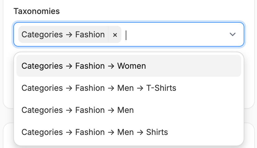 Taxonomies: Assign categories, collections, or brands (e.g., Fashion → Women → Tops). Products will appear anywhere the taxon is used on the site.