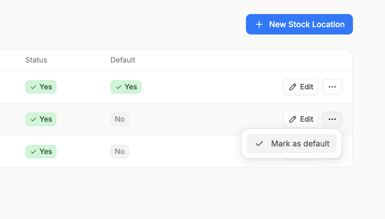 To set your default Location, click the three dots on the right hand side of the Location’s row and select ‘Mark as default’ from the menu.