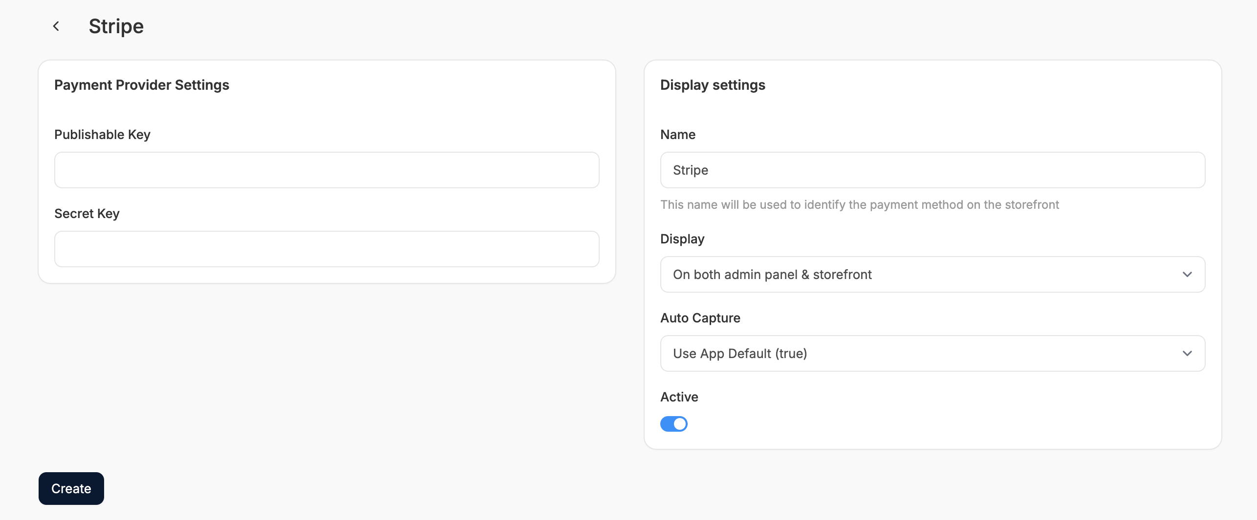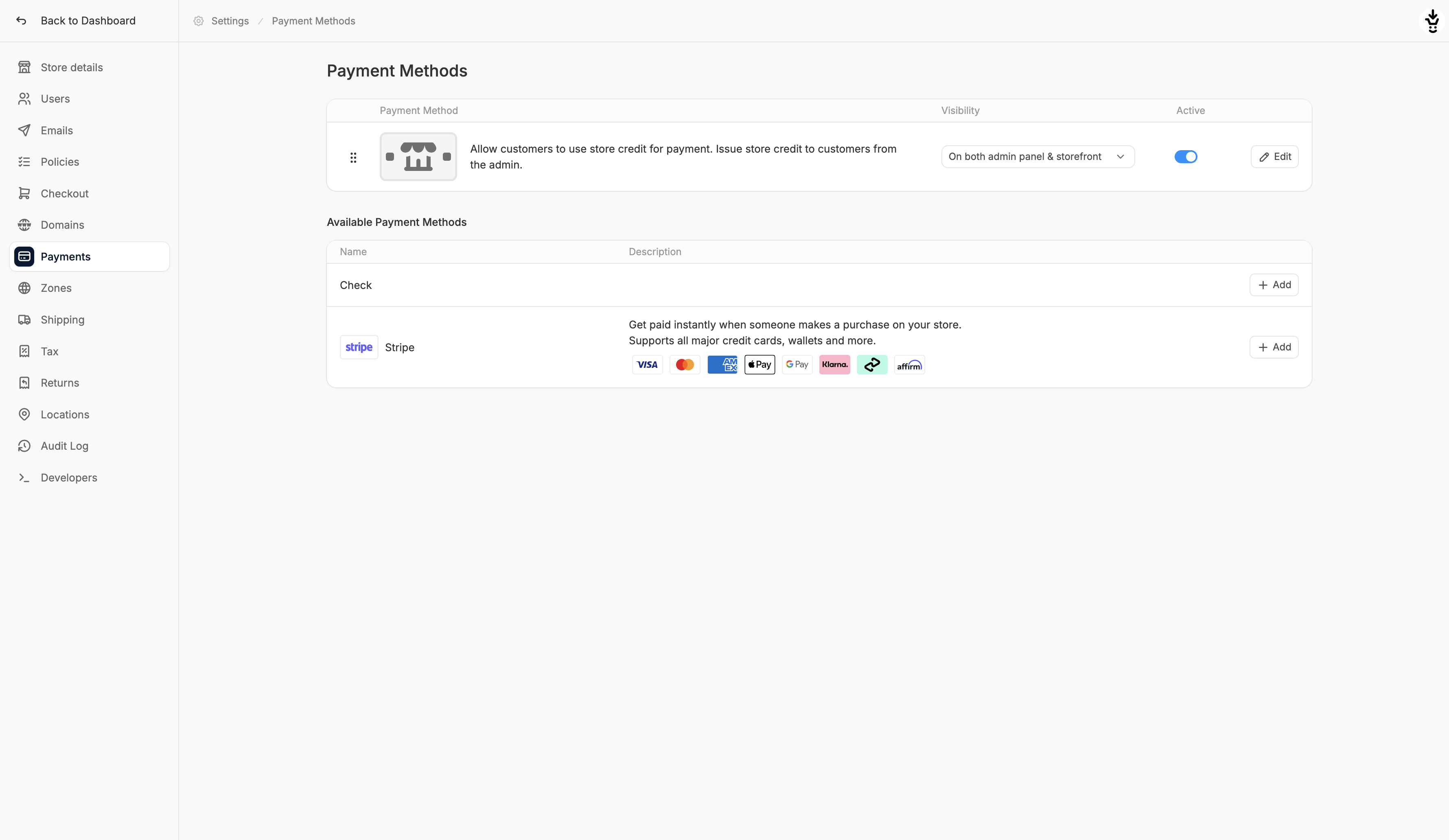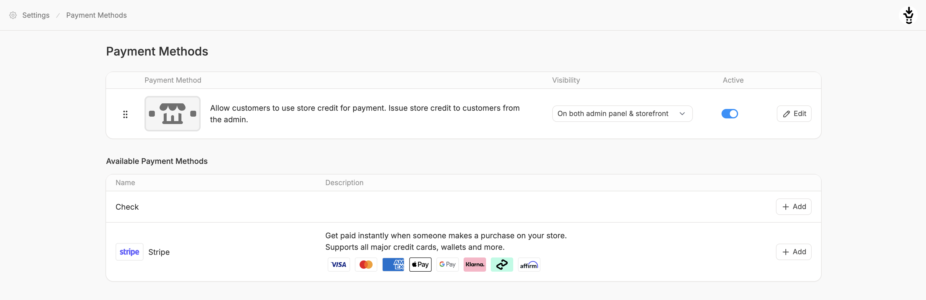 Once you’ve entered all the required fields, click Create to add the payment method. The method will now be listed in your store’s enabled payment methods and will be available to users on checkout (provided it is active and visible).Edit a Payment Method