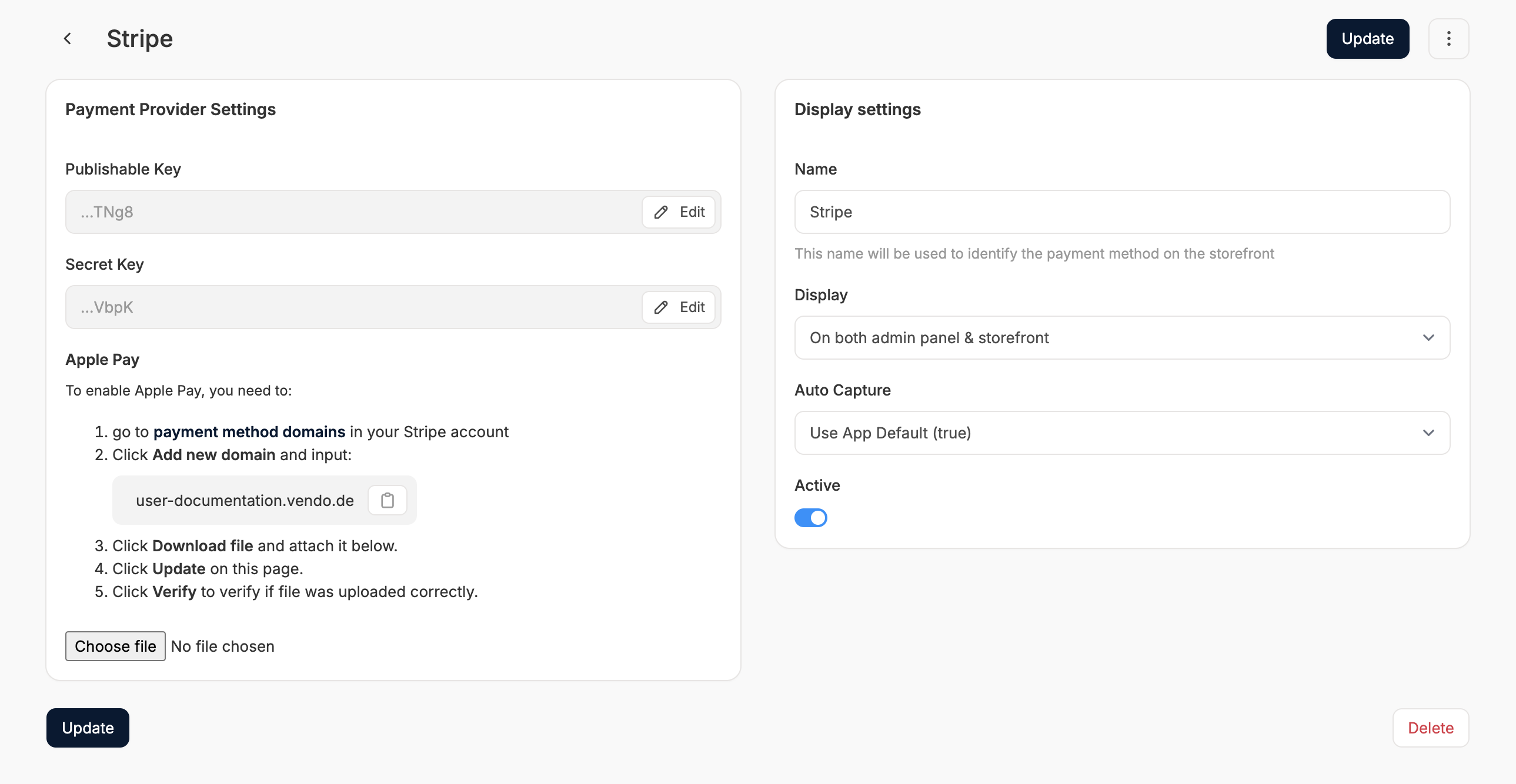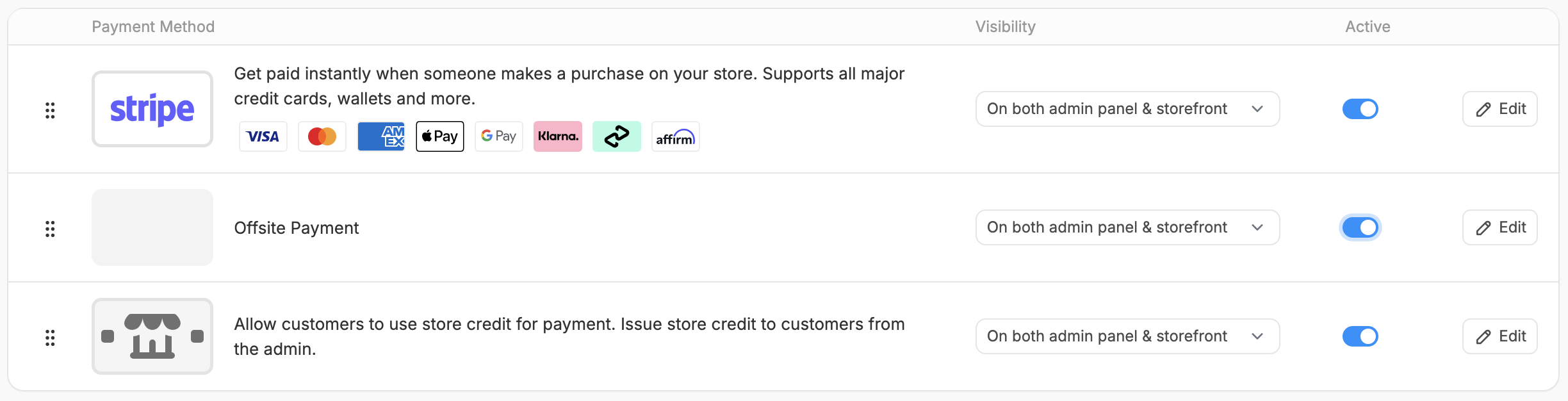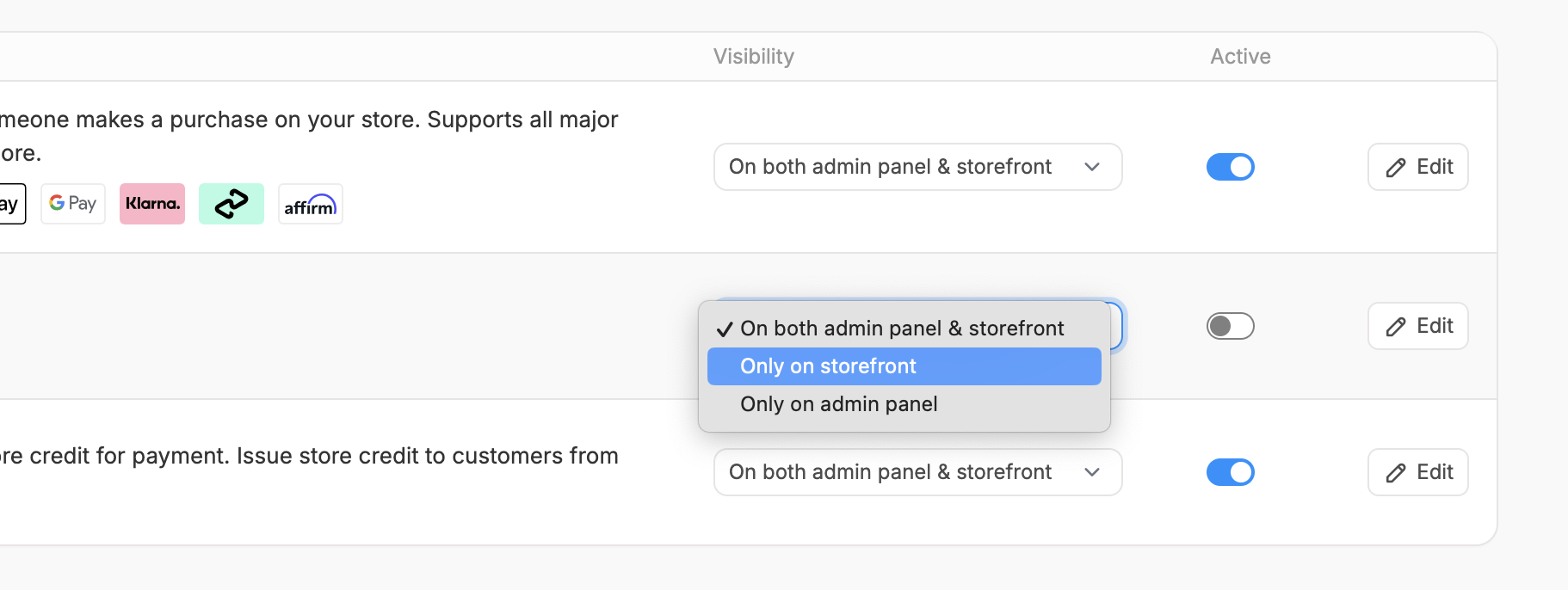 Once you’ve entered all the required fields, click Create to add the payment method. The method will now be listed in your store’s enabled payment methods and will be available to users on checkout (provided it is active and visible).Edit a Payment Method