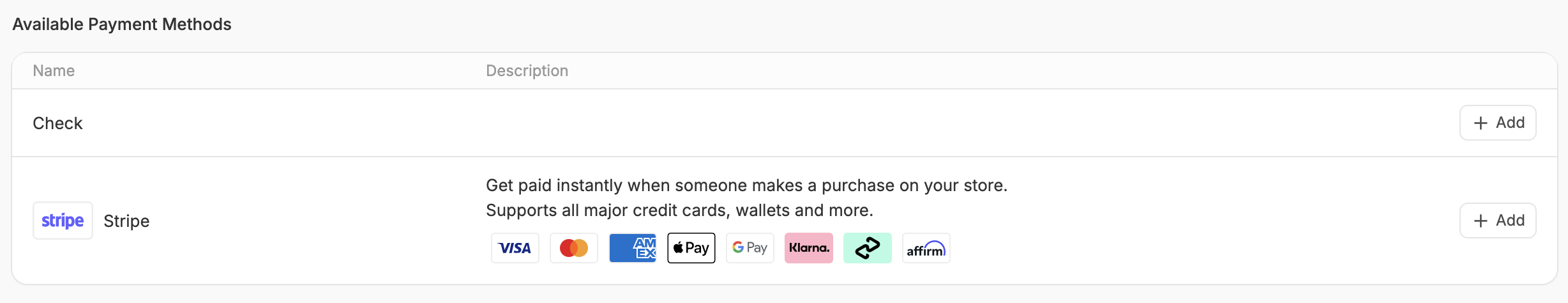 To add a payment method, click Add on the corresponding row in the Available Payment Methods list. This will direct you to the payment method creation form for that method.