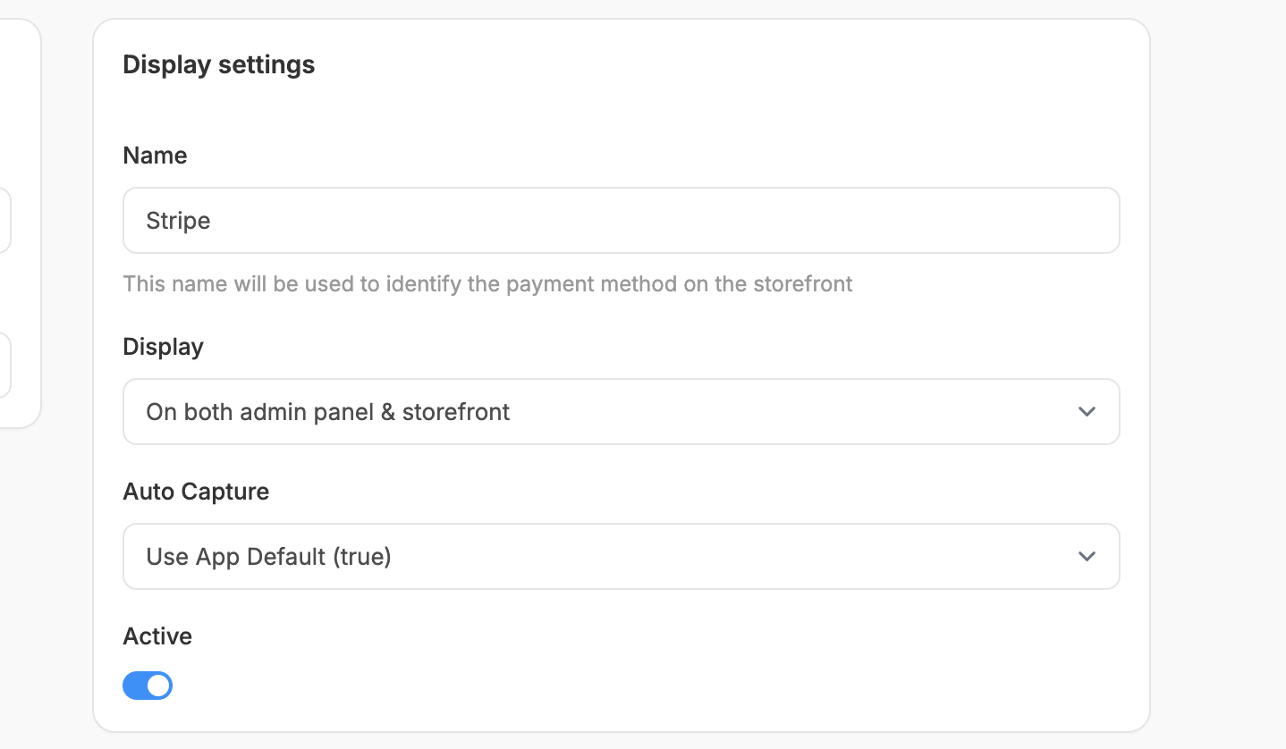 - Auto Capture: Determines whether payment is captured automatically at the time of authorization. Use the app default or override it per method.