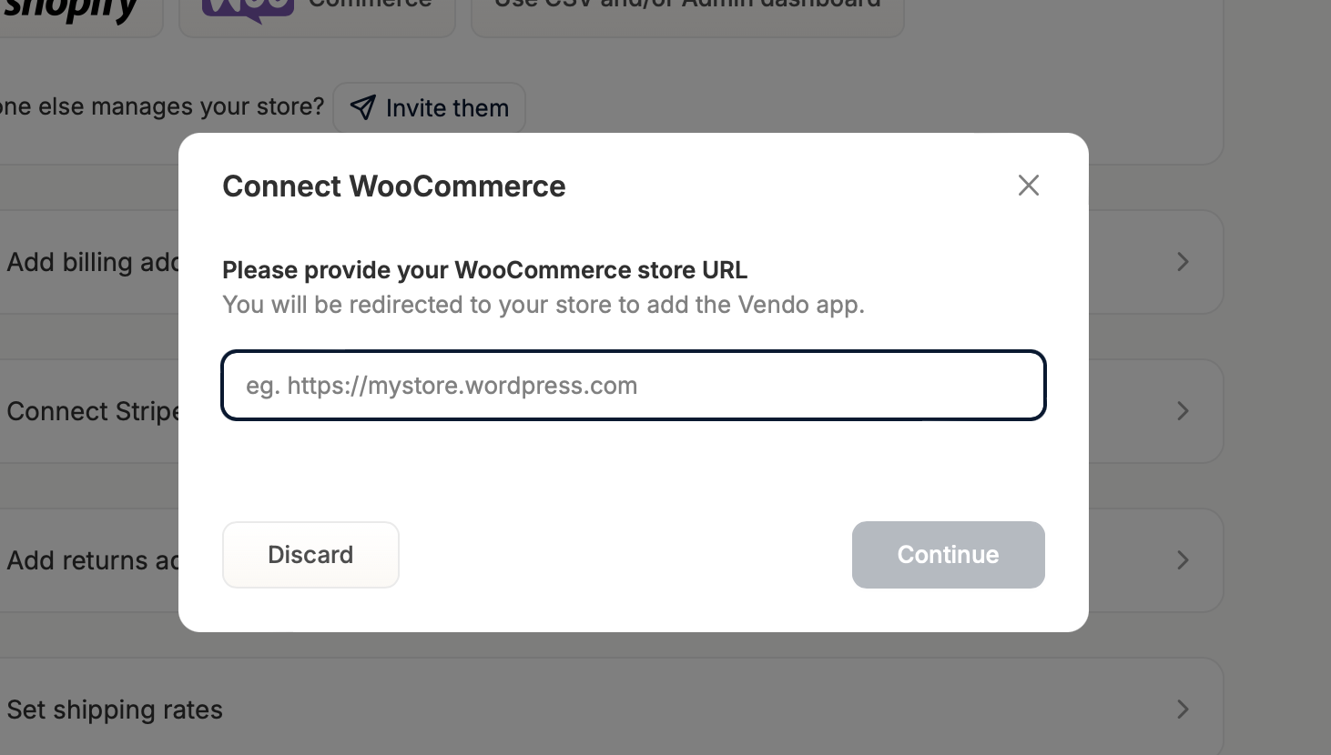 The WooCommerce store connector works similarly to the Shopify connector by automating important parts of the onboarding process. To connect your WooCommerce store to the marketplace, click ‘WooCommerce’. Doing so will open a popup that requires you to enter your WooCommerce store’s URL.
