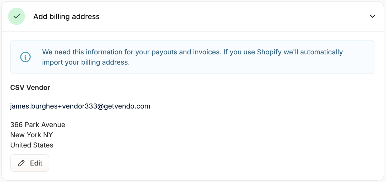 Adding your company’s billing address is essential as it is needed for vendor payouts and invoices. Simply click on the task to reveal the form and enter your company’s billing information.