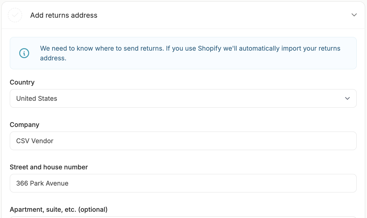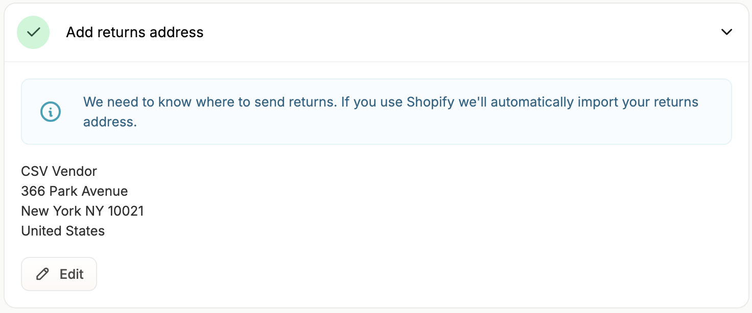 Adding a return address as a vendor is important because it ensures customers know where to send returns, streamlining the return process and helping maintain a positive customer experience. Simply click on the task to reveal the form, and enter your company’s return address.