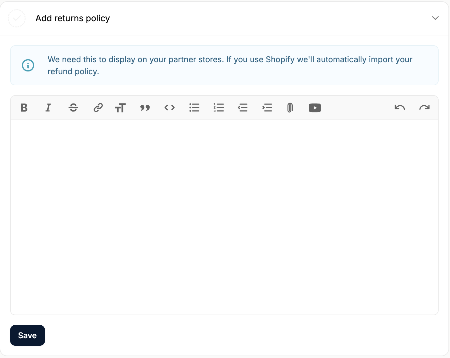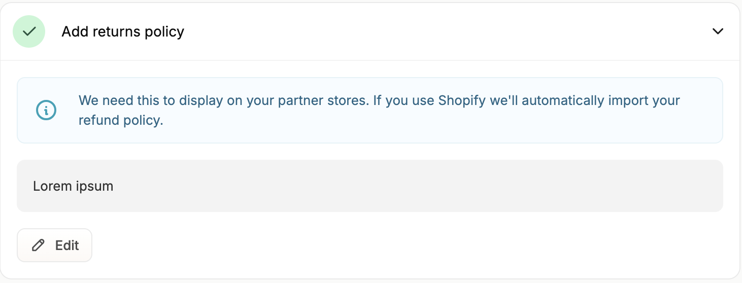 Last but not least, you’ll need to add a return policy. Adding a return policy as a vendor is important because it builds trust with customers, sets clear expectations, and helps prevent disputes over returns and refunds. Simply click on the task to reveal the text field.