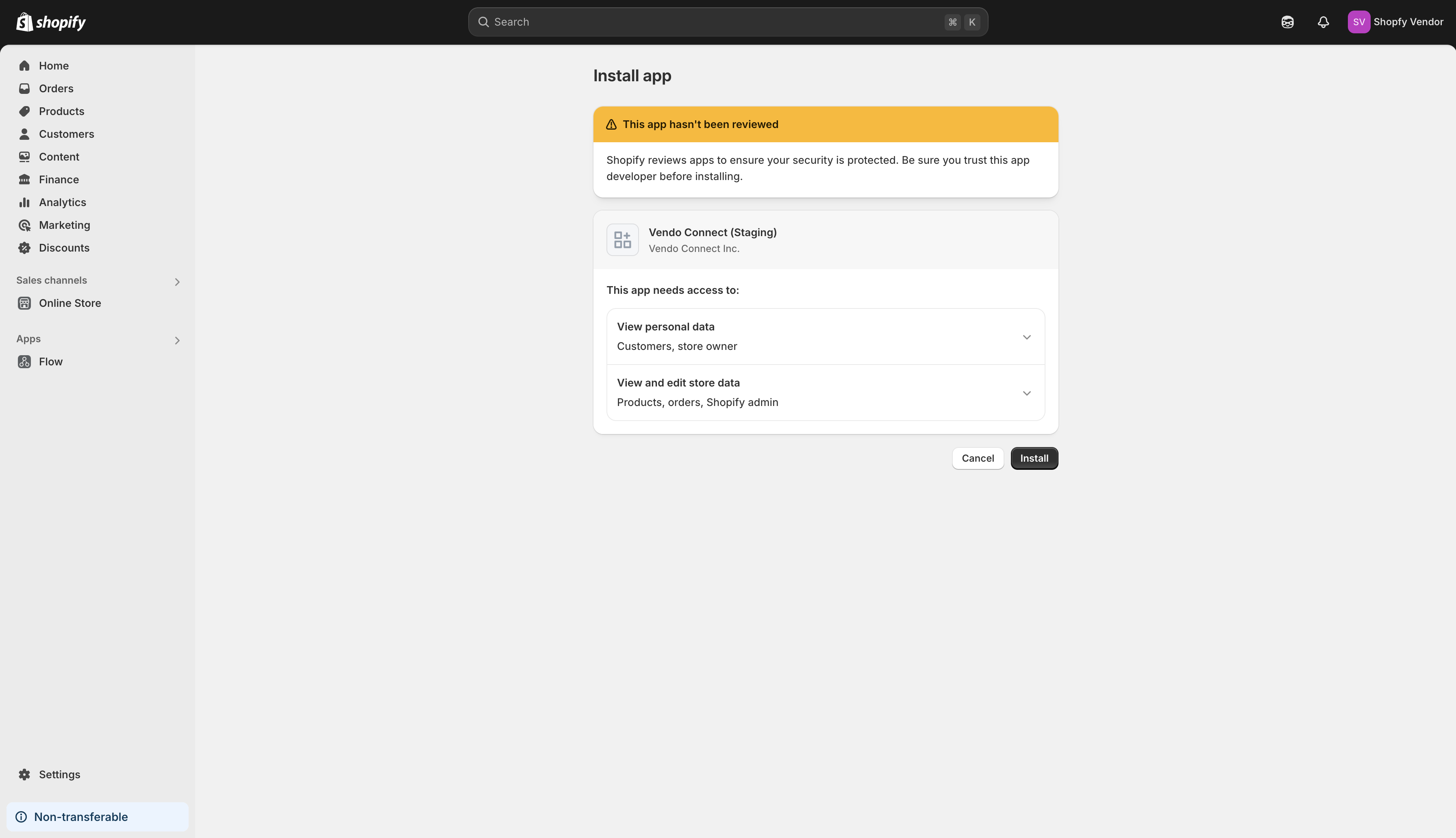 If you are running a Shopify store, you’ll be glad to know that onboarding is completely automated. To connect your store to the marketplace, click the ‘Shopify’ button. Doing so will redirect you to the Shopify app store with a prompt to install the marketplace’s app. Click ‘Install’ and you’ll be redirected to your Shopify dashboard with another prompt to install the app.