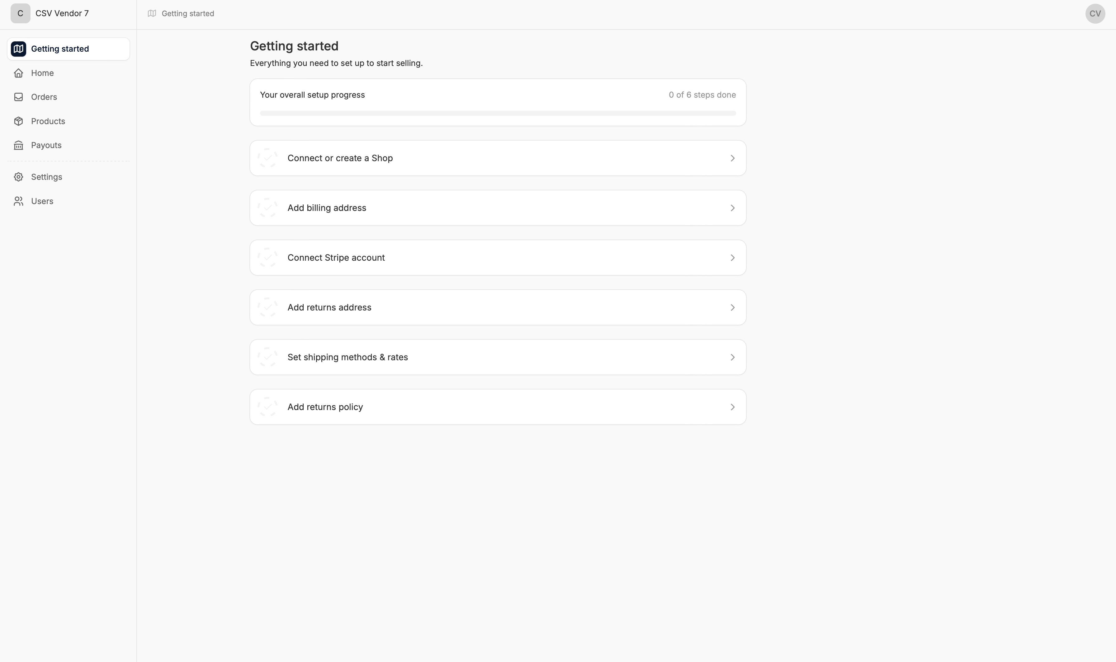 As the name suggests, this method requires you to add products manually one-by-one or by uploading a product CSV file. To use this method to add products to the marketplace, click ‘Use CSV and/or Admin dashboard’ and the task will be checked off.