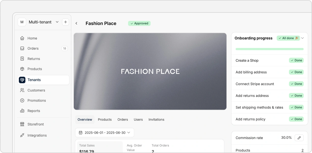 Tenants can manage products, orders, customers, promotions, and reports from a tenant dashboard. Customize the tenant experience to your use case.